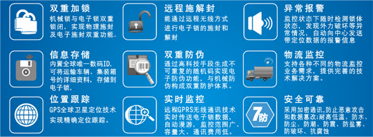 远程电子锁:不需要司机开锁,到达目的地由服务中心人员进行开锁工作。 实时监控:7*24小时实时监控,保证报警的顺利解除和处理。 多重报警:针对集装箱可能出现的情况有相应的传感器:温度、湿度、跌落、翻转进行报警。 安全可靠:防水、防尘、防盐雾等处理手段,保证在非正常状况下可靠工作。